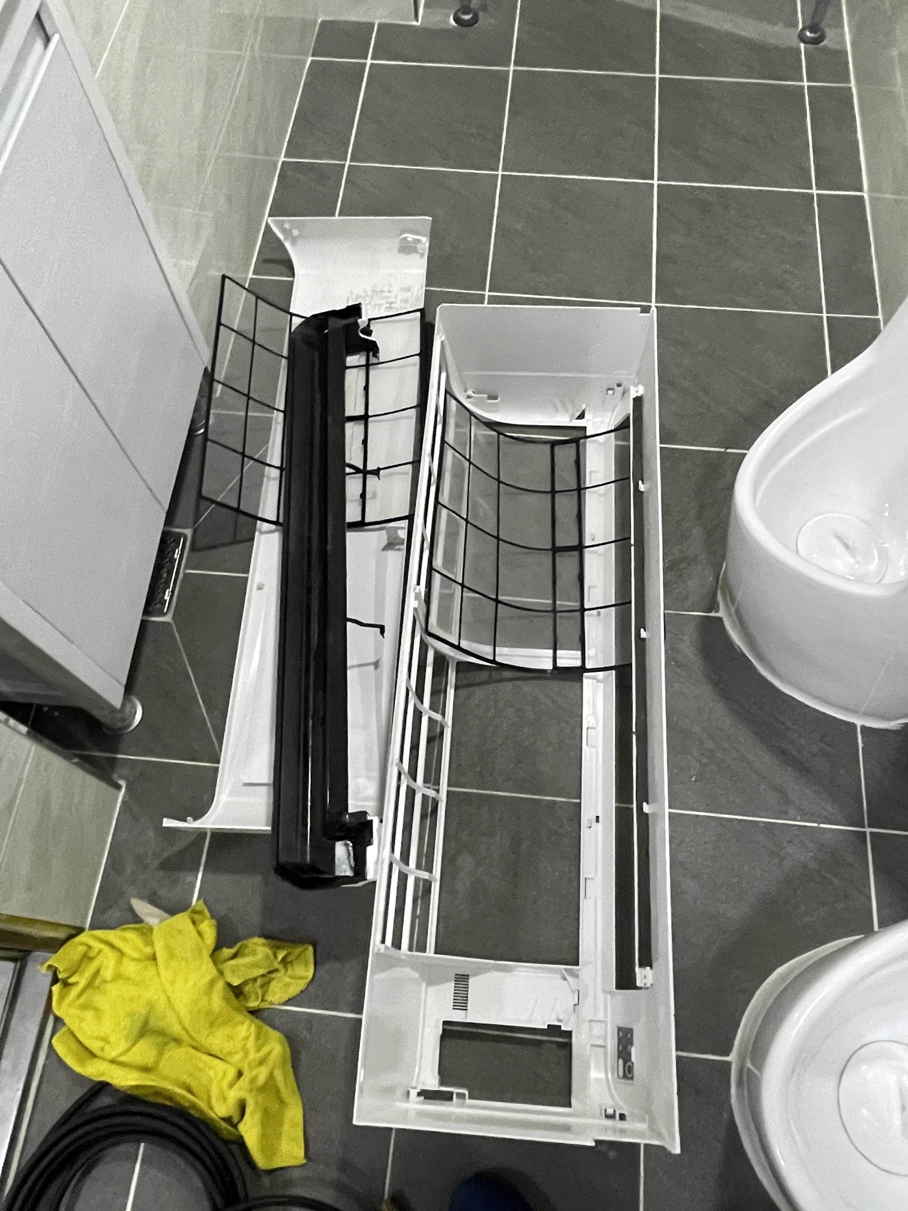 분해한 에어컨은 공용 화장실에서 깨끗하게