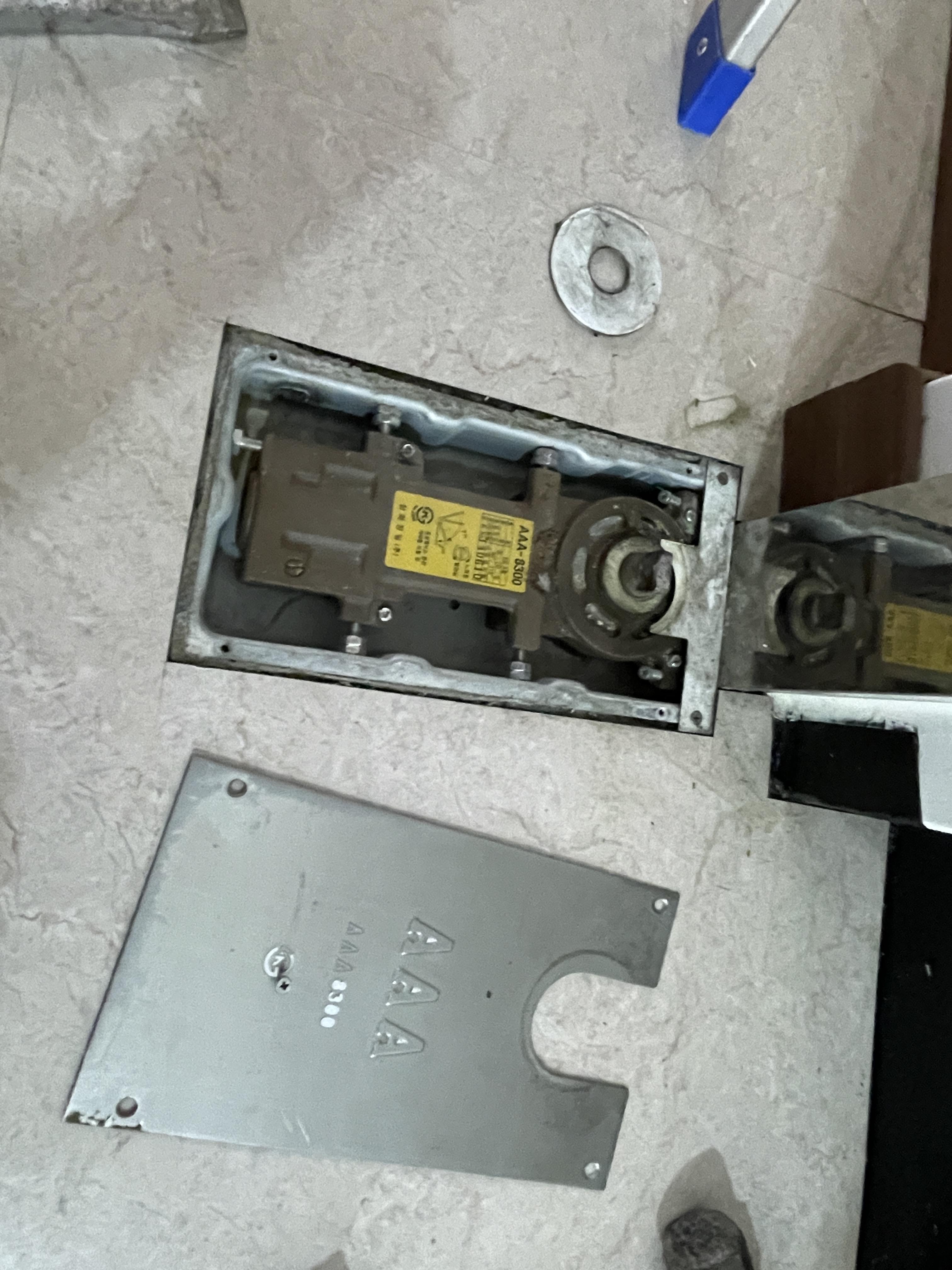 바로 유리문 아래 설치된 강화도어 힌지의 고장이라