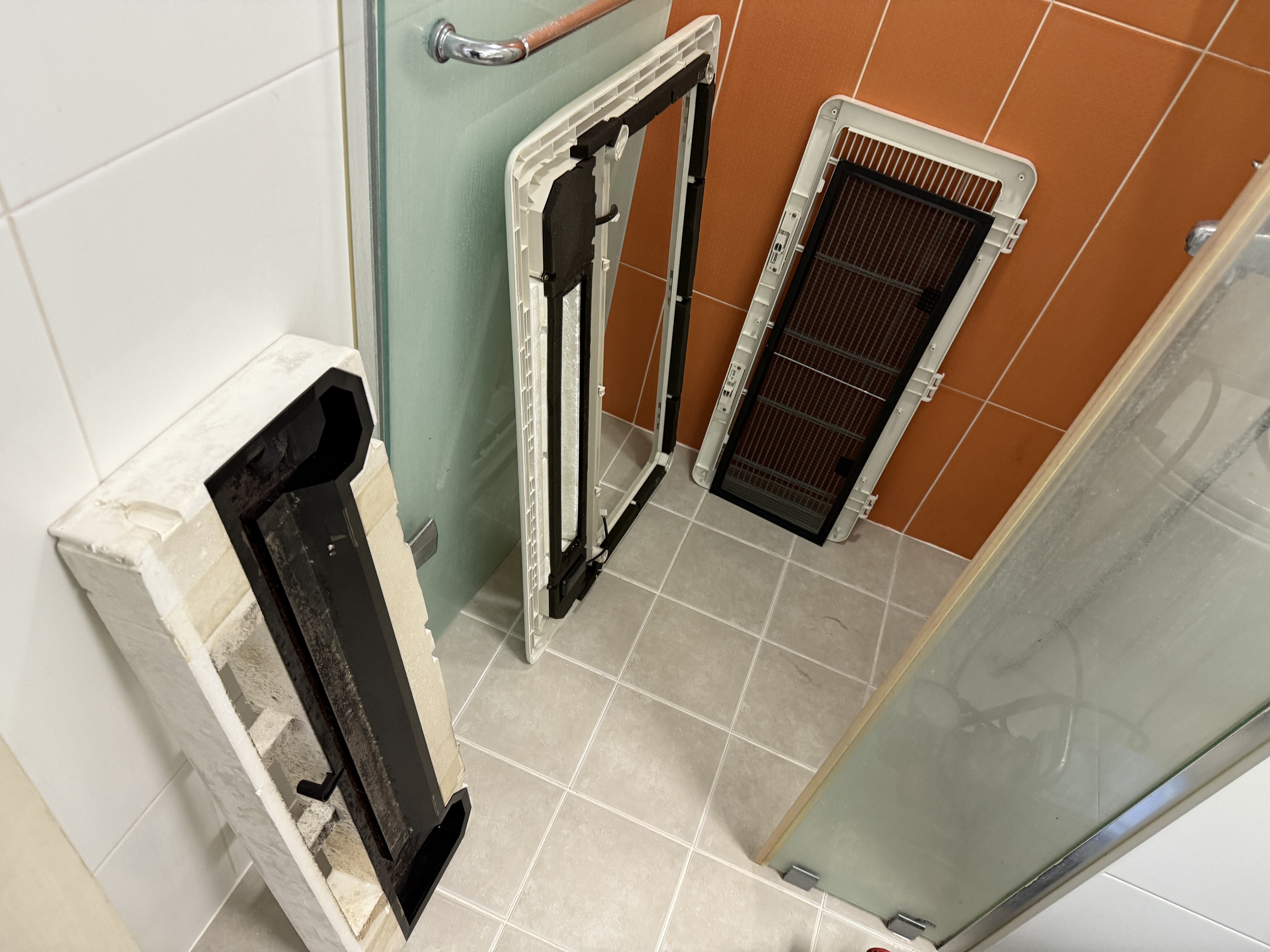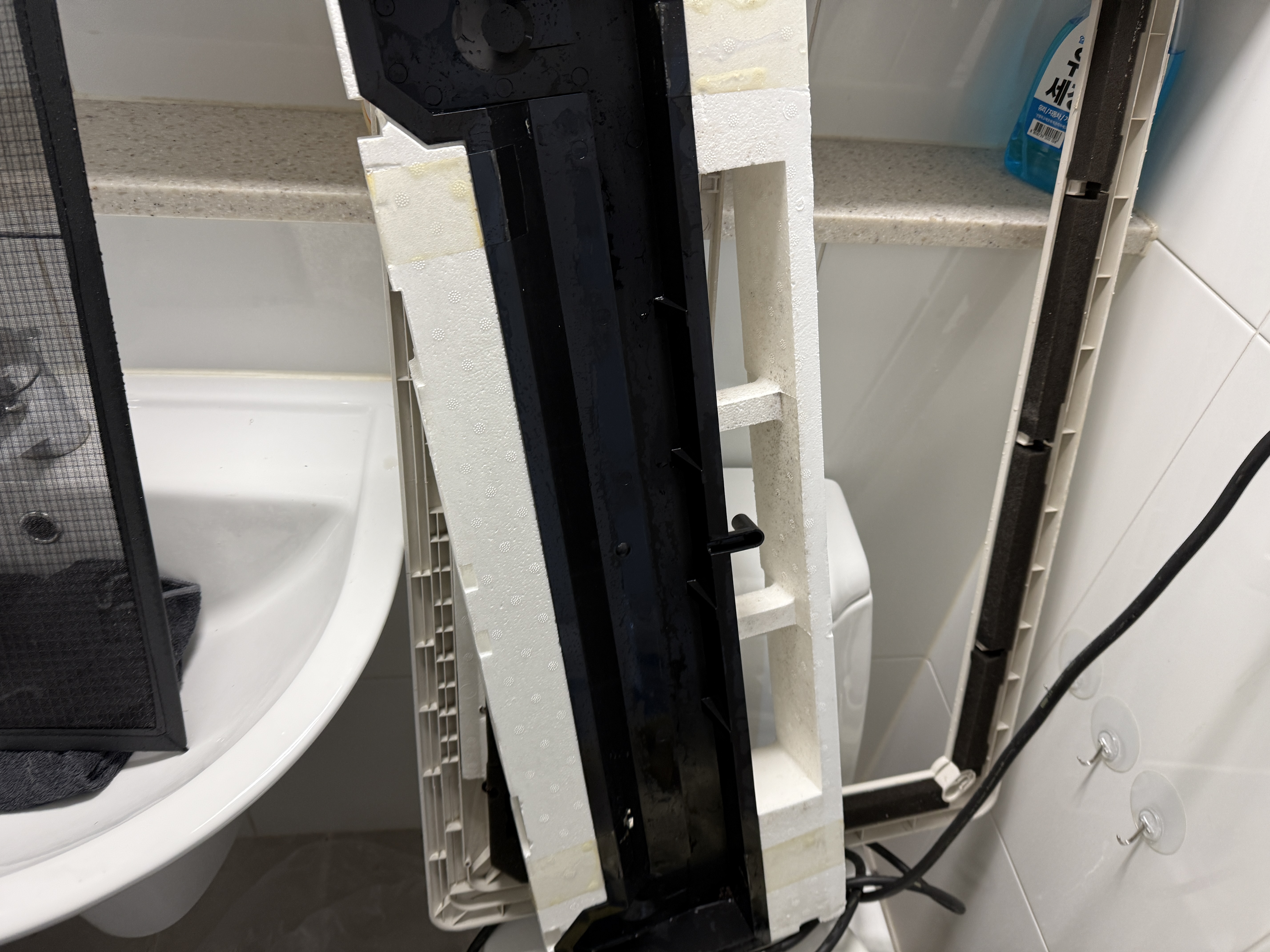 에어컨을 분해하여 화장실로 가져 갑니다.