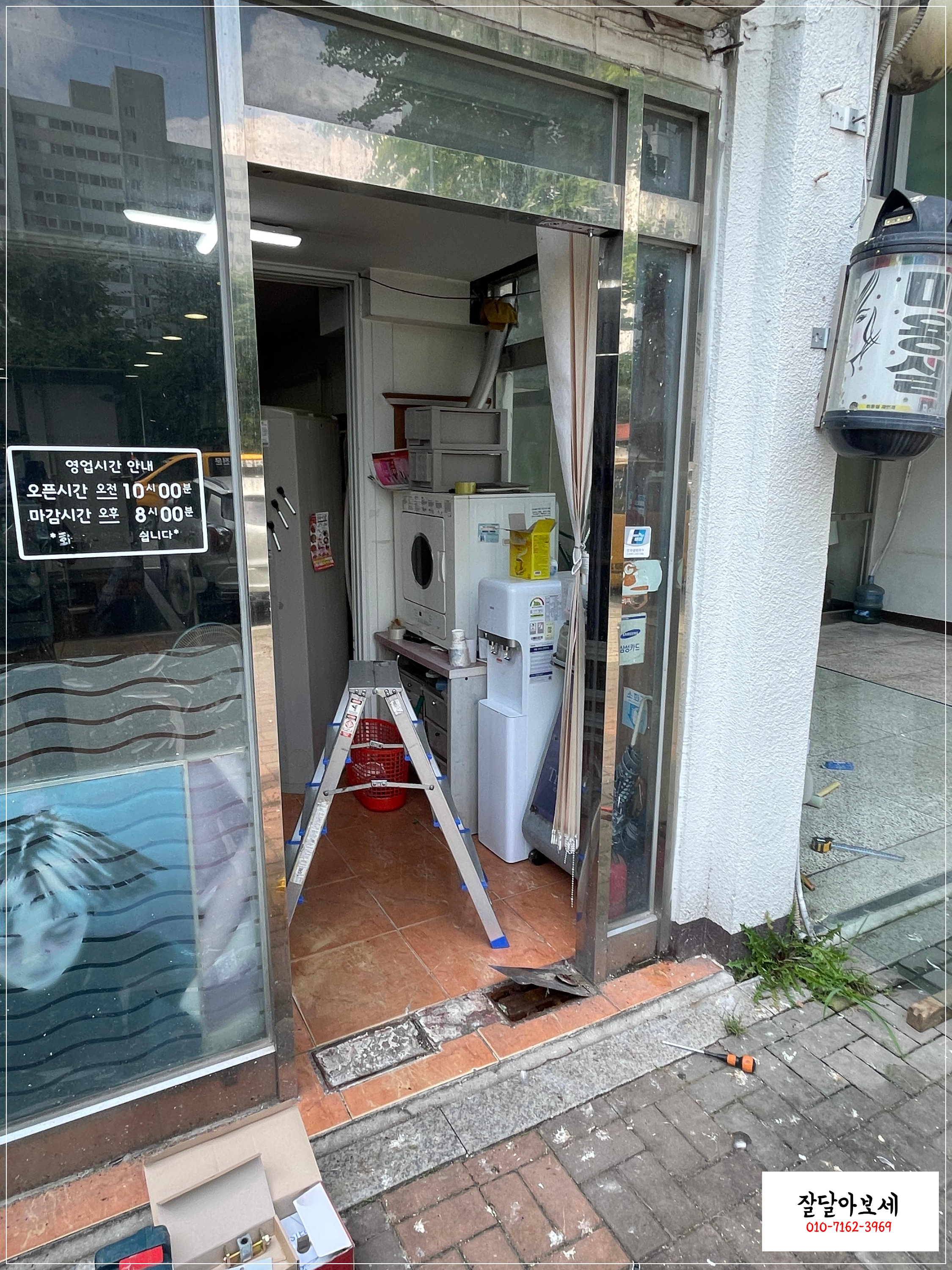 실제 상가 유리문 수리 사진, 강화도어 수리 전후 비교
